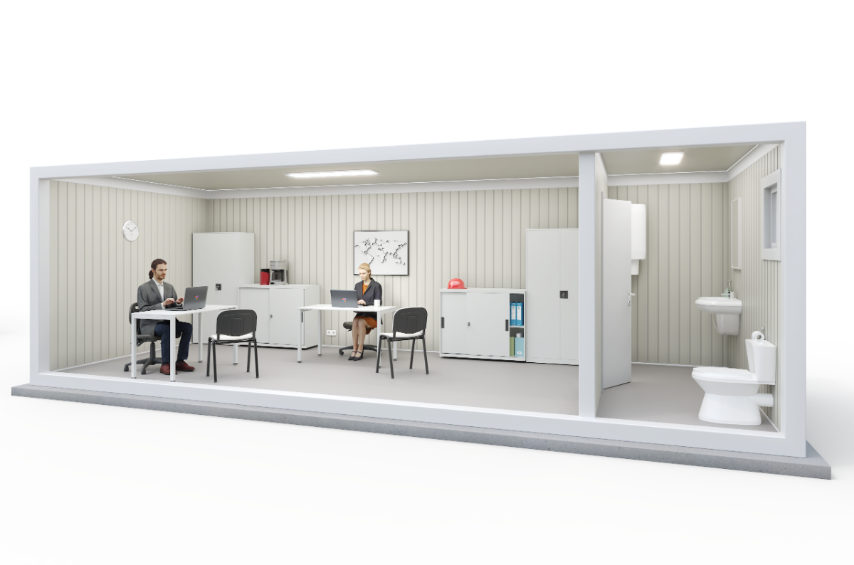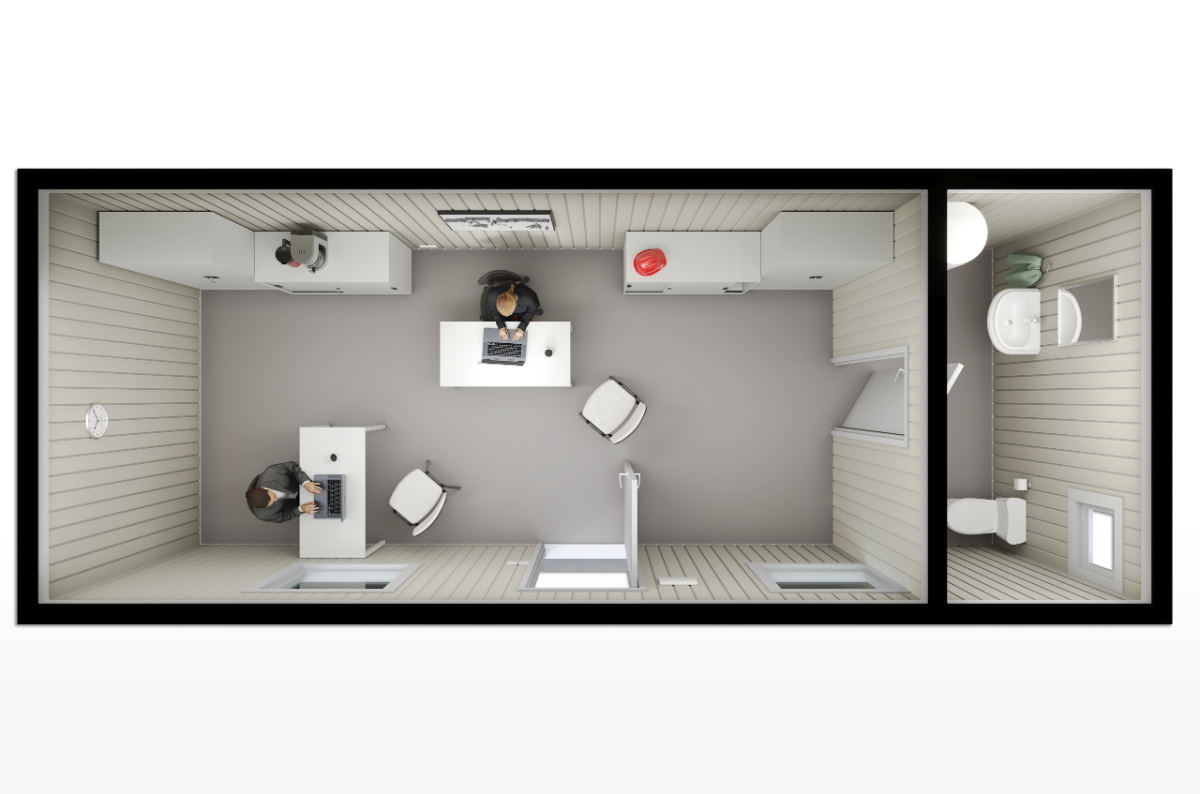 1 piece exterior PVC door with frame and sash, 5 point locking system, aluminum threshold, 3 hinges, panel type, 950×2050 mm. 1 piece interior door for the sanitary unit, 800×2000 mm. 2 pieces PVC windows with frame and sash, tilt and turn, 1200×1000 mm. 1 piece PVC tilt and turn window for the sanitary unit, 500×500 mm.