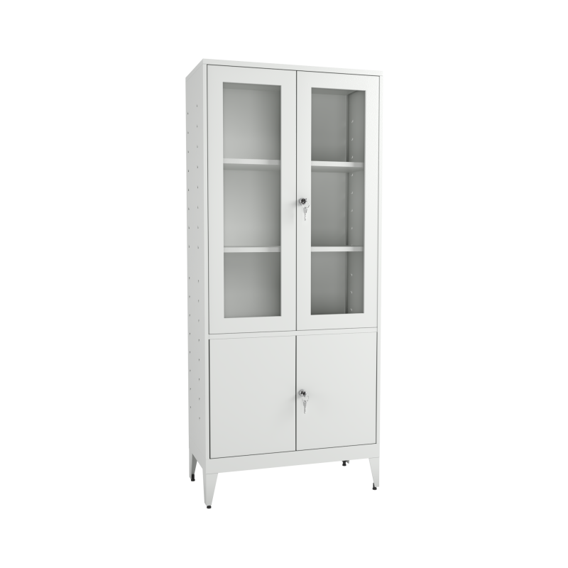 The upper section is fitted with 2 doors made of organic glass (plexiglass) or glass, mounted in a metal frame. The lower section is equipped with 2 metal doors.