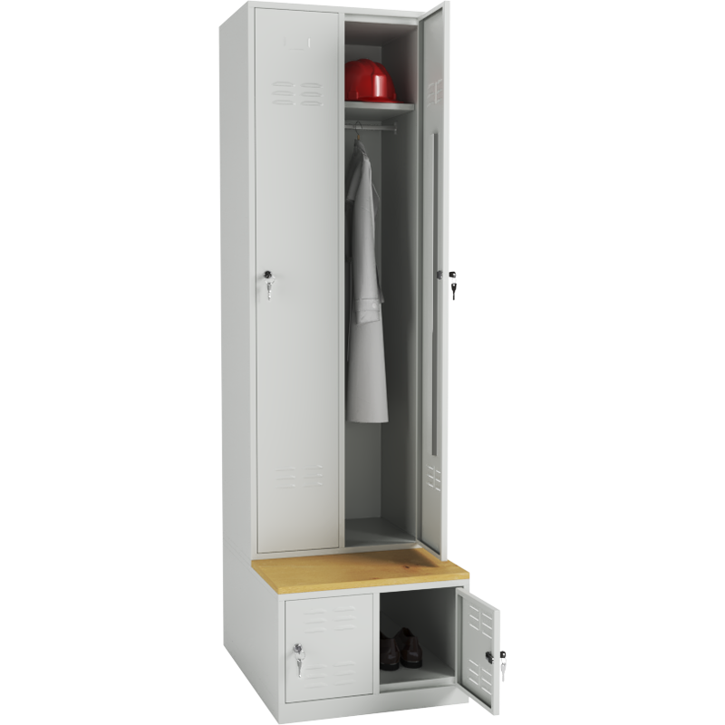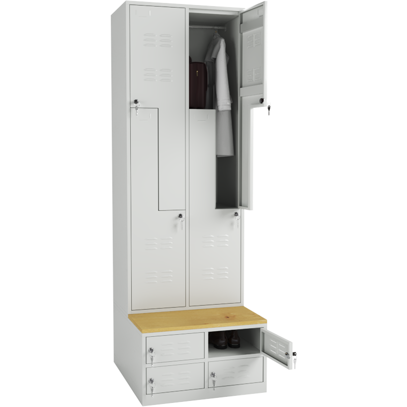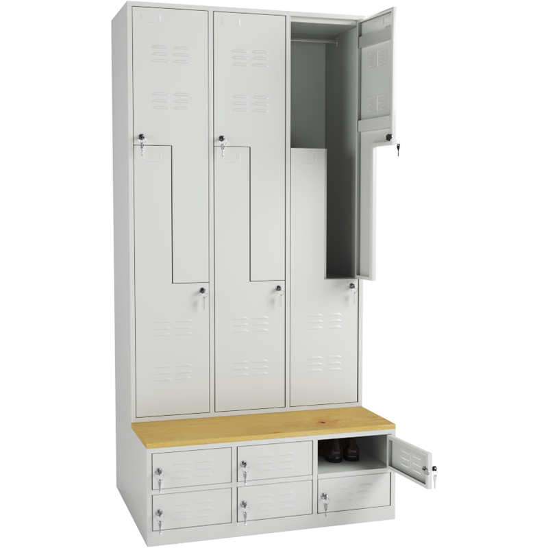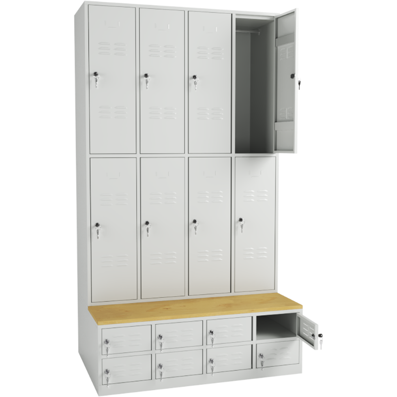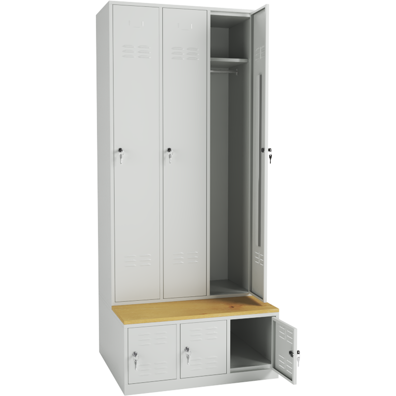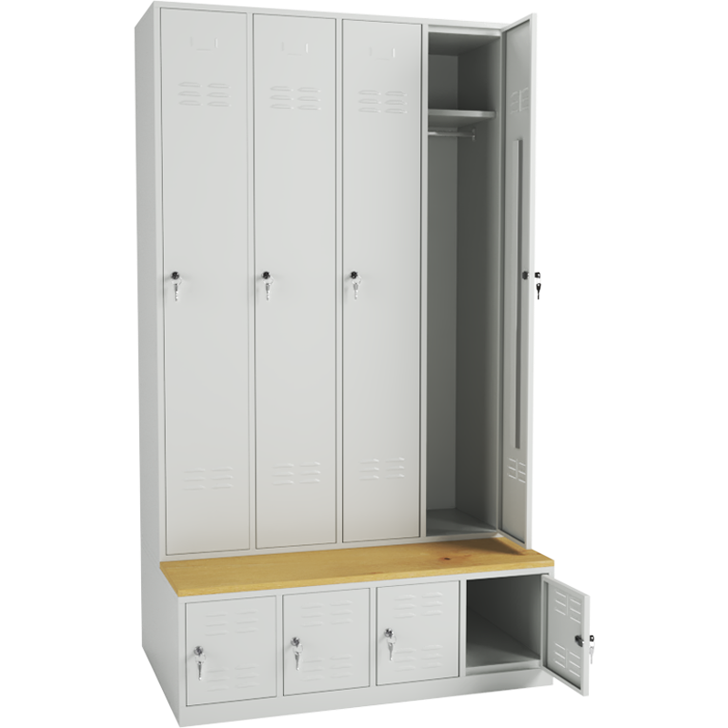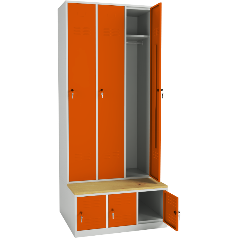 Locker fitted with seating bench made of laminated spruce-colored top with ABS edge banding