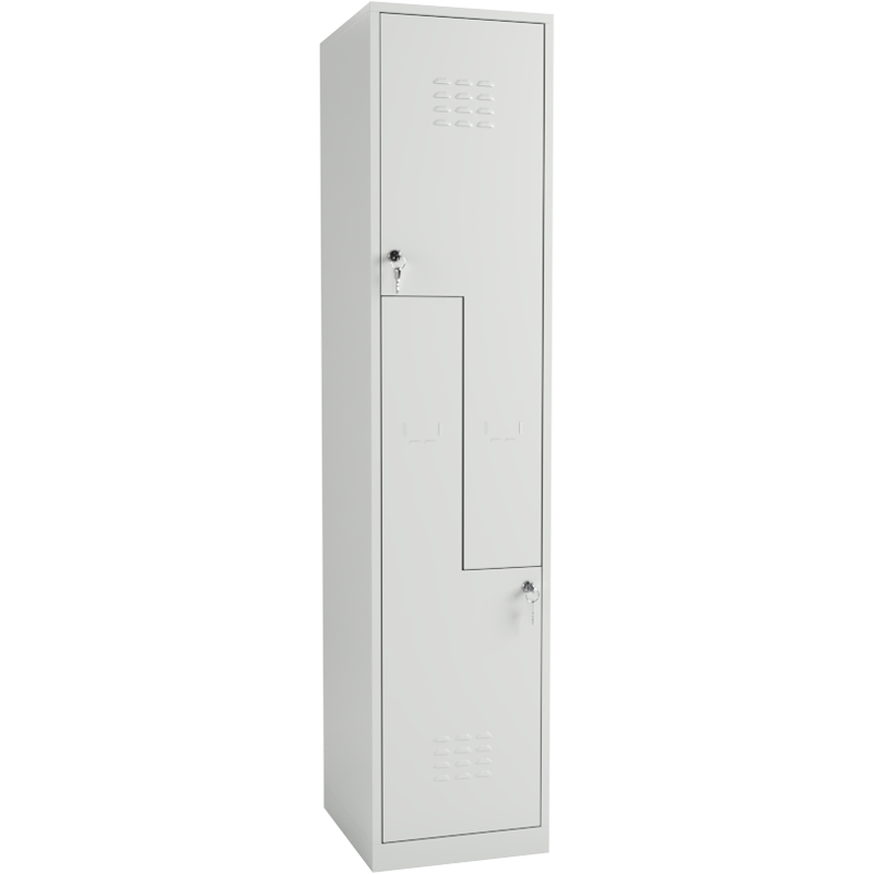 2 uși în formă Z, fiecare prevăzută cu profile de rigidizare sudate la interior, fante de aerisire, suport etichetă. Balamalele ușilor nu sunt vizibile.
